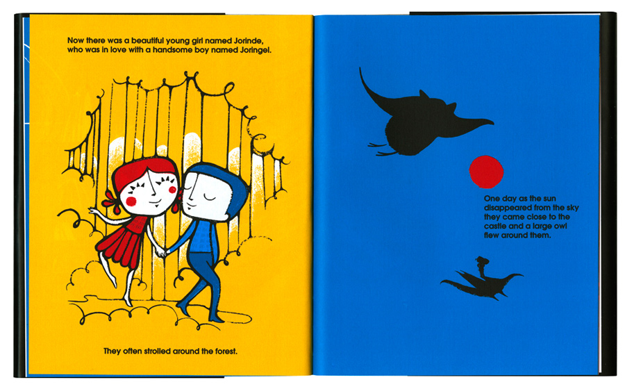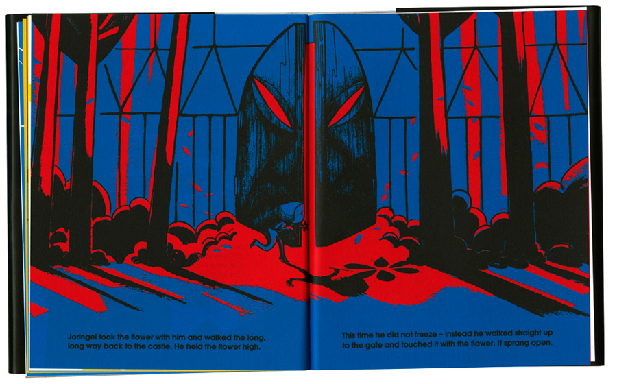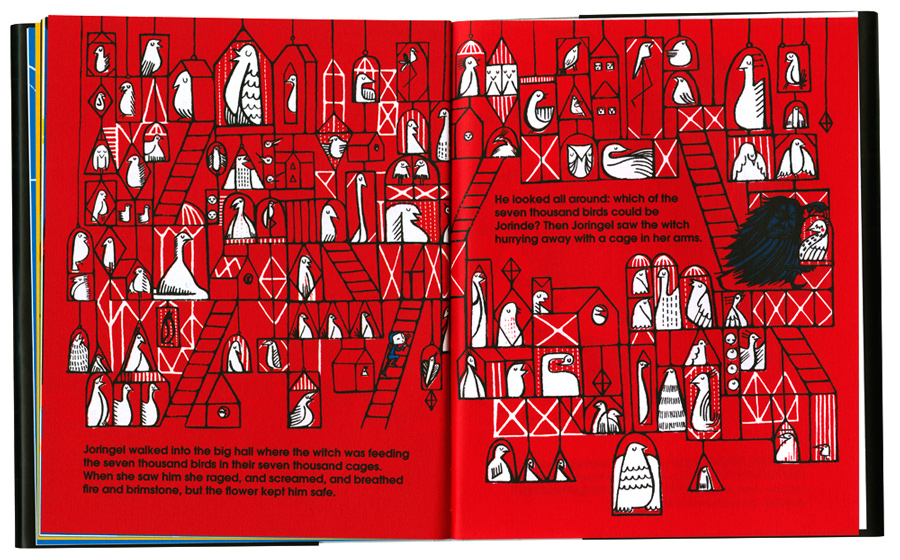 Rilla Alexander's illustrations for the Grimm fairy tale Jorinde & Joringel"This pocket sized book tells the Grimm Brothers tale of Jorinde who is transformed into a bird by an evil witch. She is trapped in a cage in the witch's castle – alongside seven thousand other birds who used to be girls. Joringel dreams of a magical red flower which will dissolve the spell and embarks on a quest to save Jorinde."